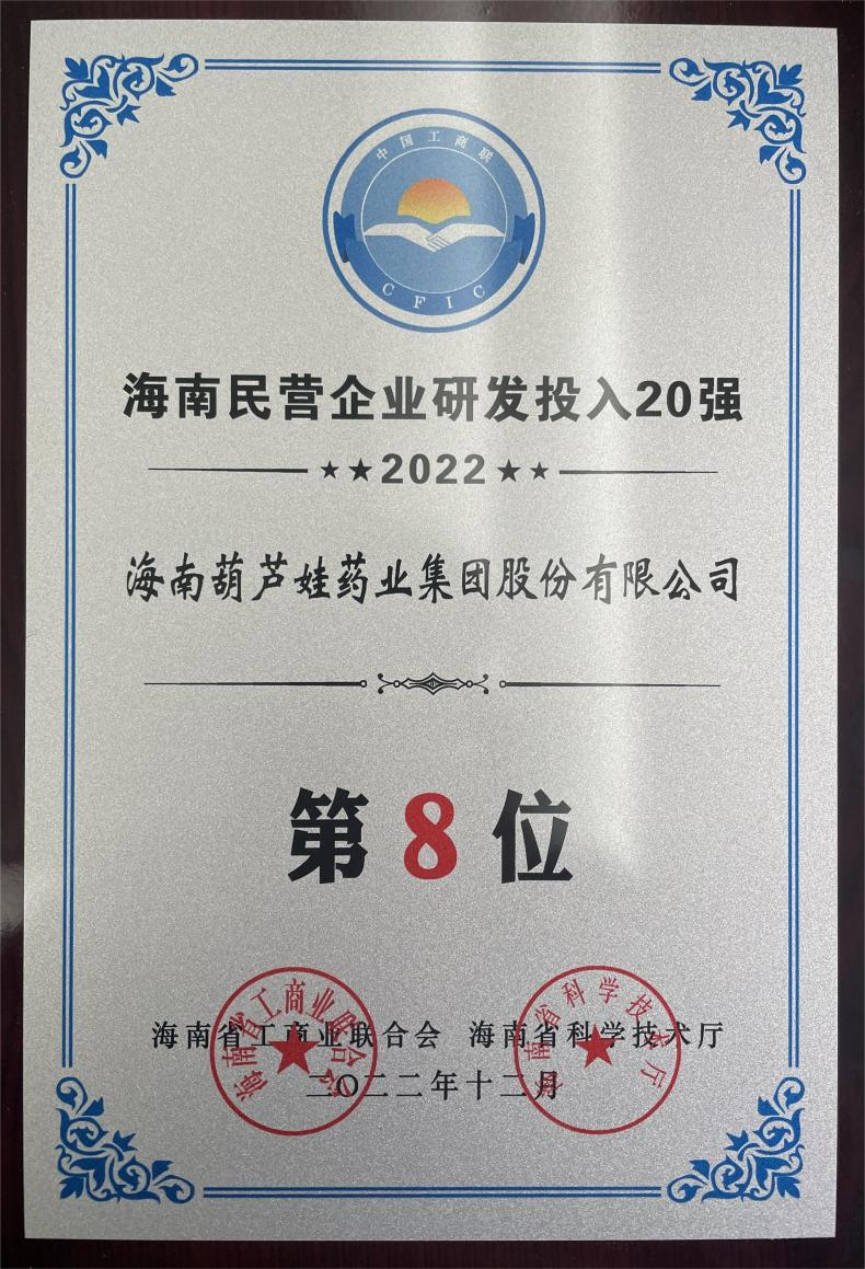 12月23日,2022海南民营企业50强和研发投入20强发布会在海口举行。会上发布了“2022海南民营企业50强”“2022海南民营企业研发投入20强”榜单和分析报告。304am永利集团药业再次荣登两榜,在海南民营企业50强榜单中位列第25位,较去年上升8位,这也是公司连续三年登榜;在海南民营企业研发投入20强中位列第8位,较去年上升7位。